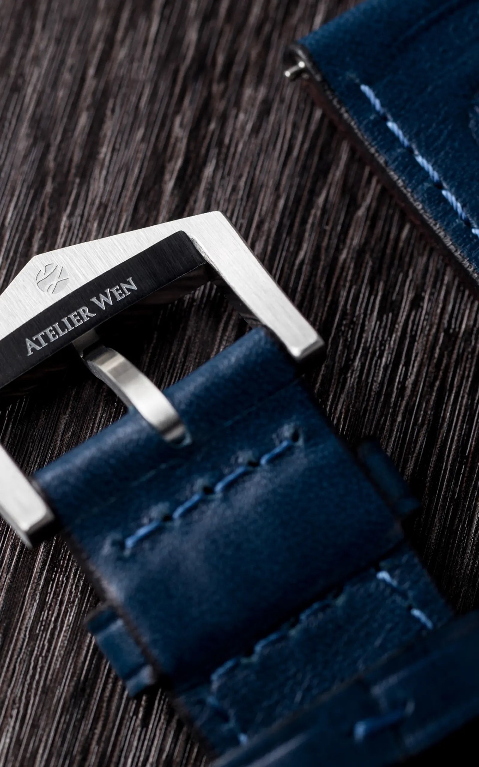 • Top-grain blue calfskin leather strap (by default), with salmon leather, brown leather and grey nubuck options.