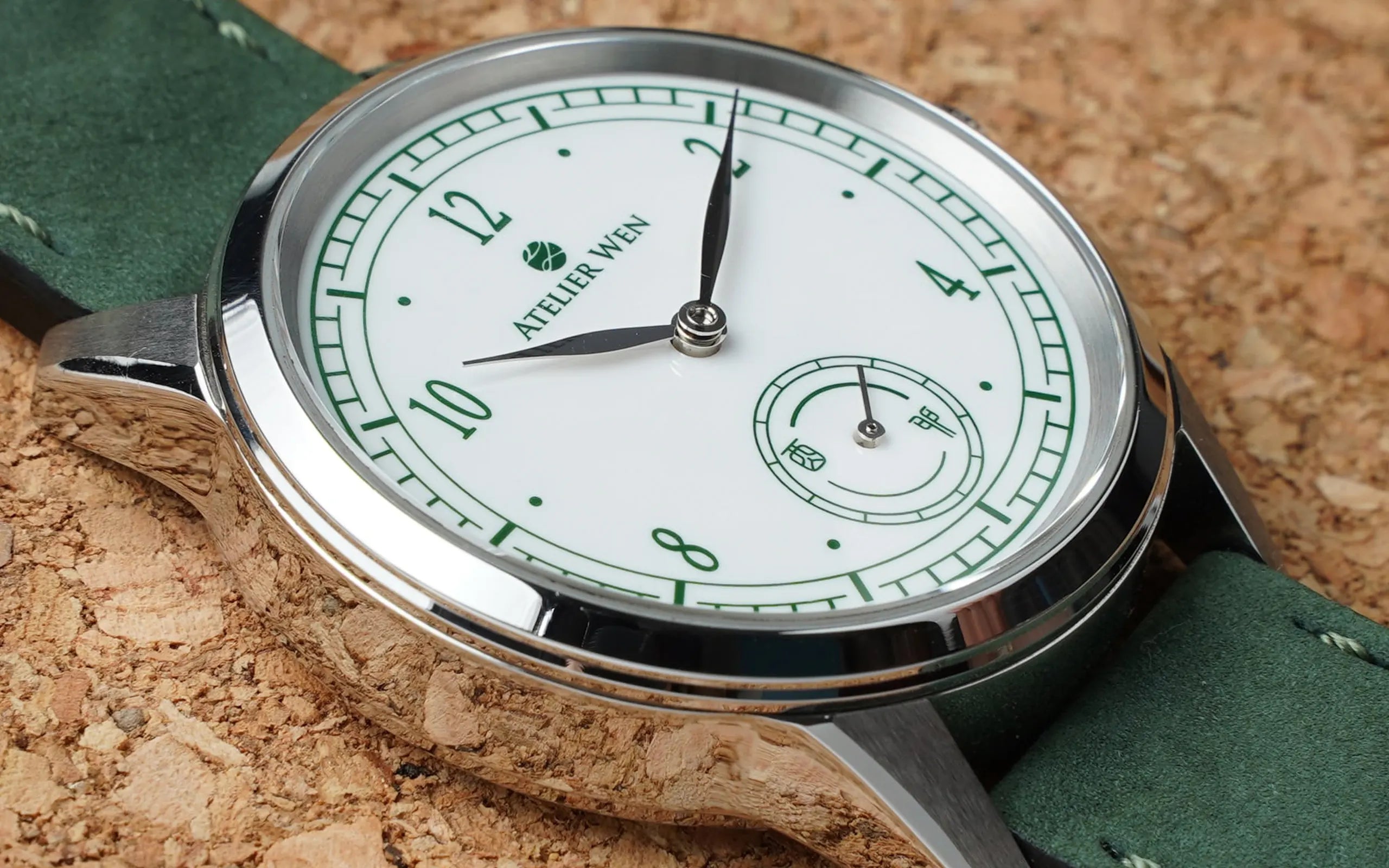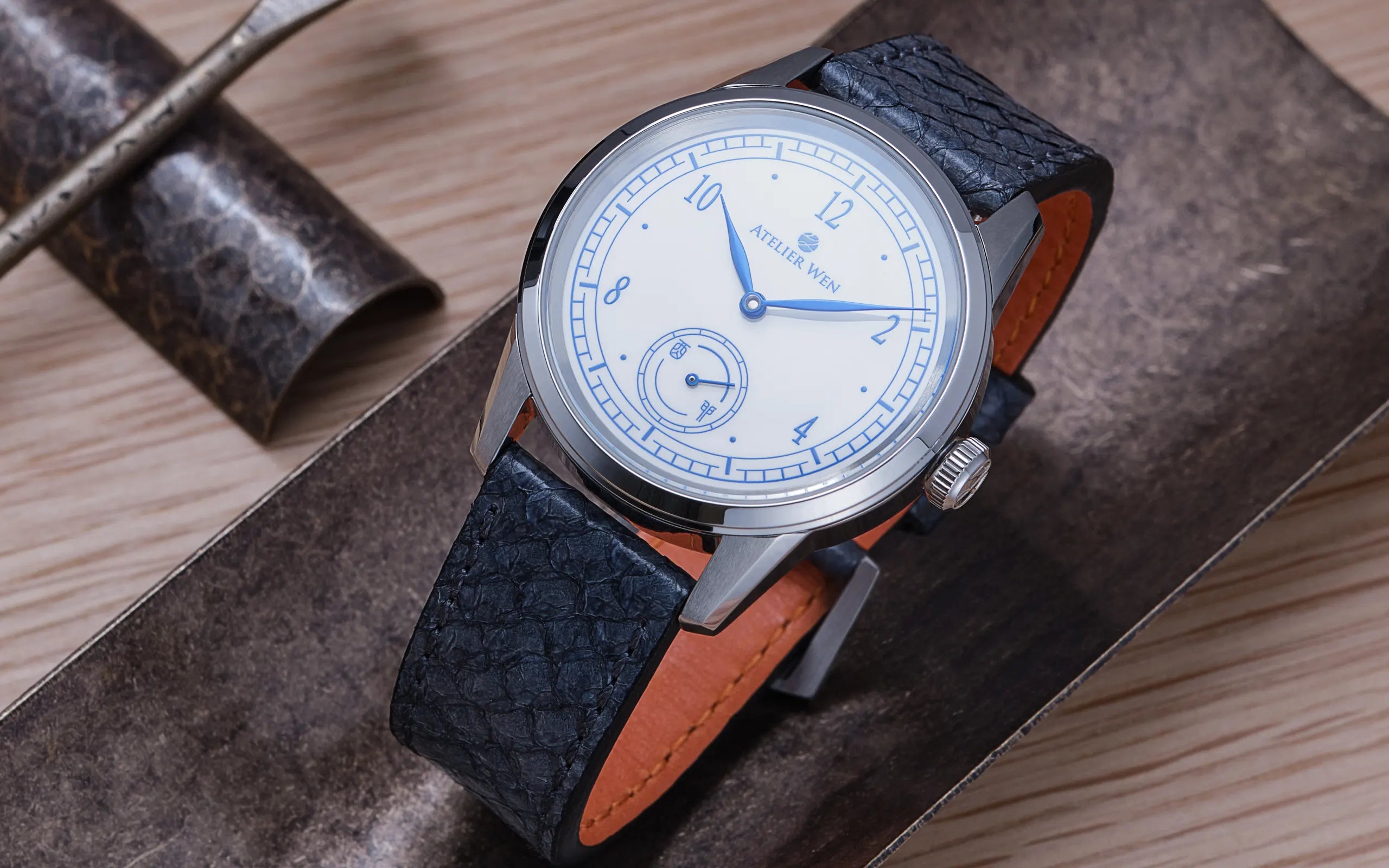 The glossy white porcelain of Hào’s dial pays tribute to famous 青花瓷 (Qing Hua porcelains) of old, so-prized for their milky translucence and elaborate decorative veneers of cobalt oxide that are fired at extremely high temperatures. Here, the semblance of these intricate patterns are reimagined through a raised print of numerals and a 回纹 (huí wén) pattern that is functionally incorporated to serve as the watch’s minute track. The overall dial composition, as mentioned, draws from chronometre watches of the 40s and 50s, and this is no coincidence. In seeking to establish an initial aesthetic, our team chose to revisit the very beginnings of watchmaking in China where the very Chinese timepieces ever made — back in Tianjin in 1955 — carried a strong influence from such chronometre watches.