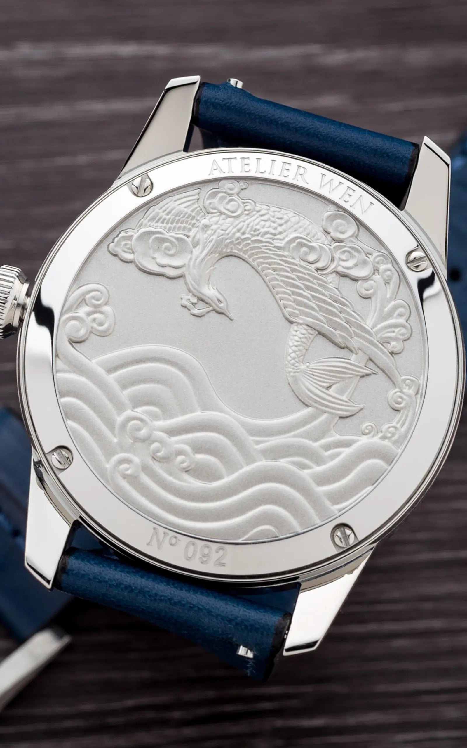The case-back found on Jì is one of the most striking aspects of this collection. It represents a deeply-embossed figure of an animal of Chinese legend, the 鲲鵬 (kun peng). Said to be a colossal bird with the ability to turn into an aquatic being , it is used as an allegory for the concept of yīn yáng. Rather than being separate entities, kun and peng are simply two sides of the same element. And in much the same way, our goal with Atelier Wen is to break down the shallow dichotomies that draw trivial lines between East and West, and in doing so, combine the experiences of both to form a greater, more meaningful whole.